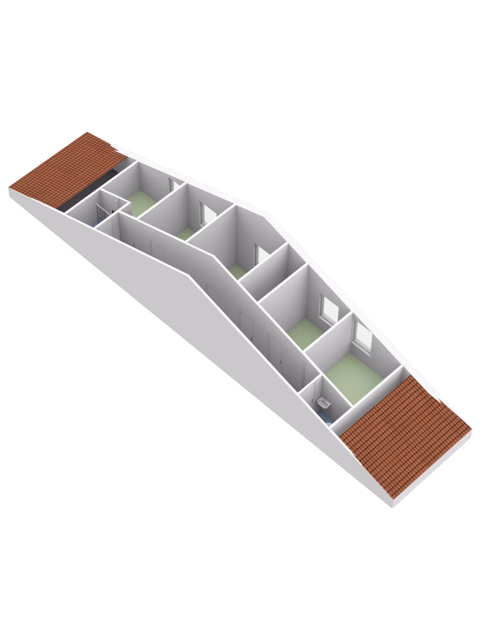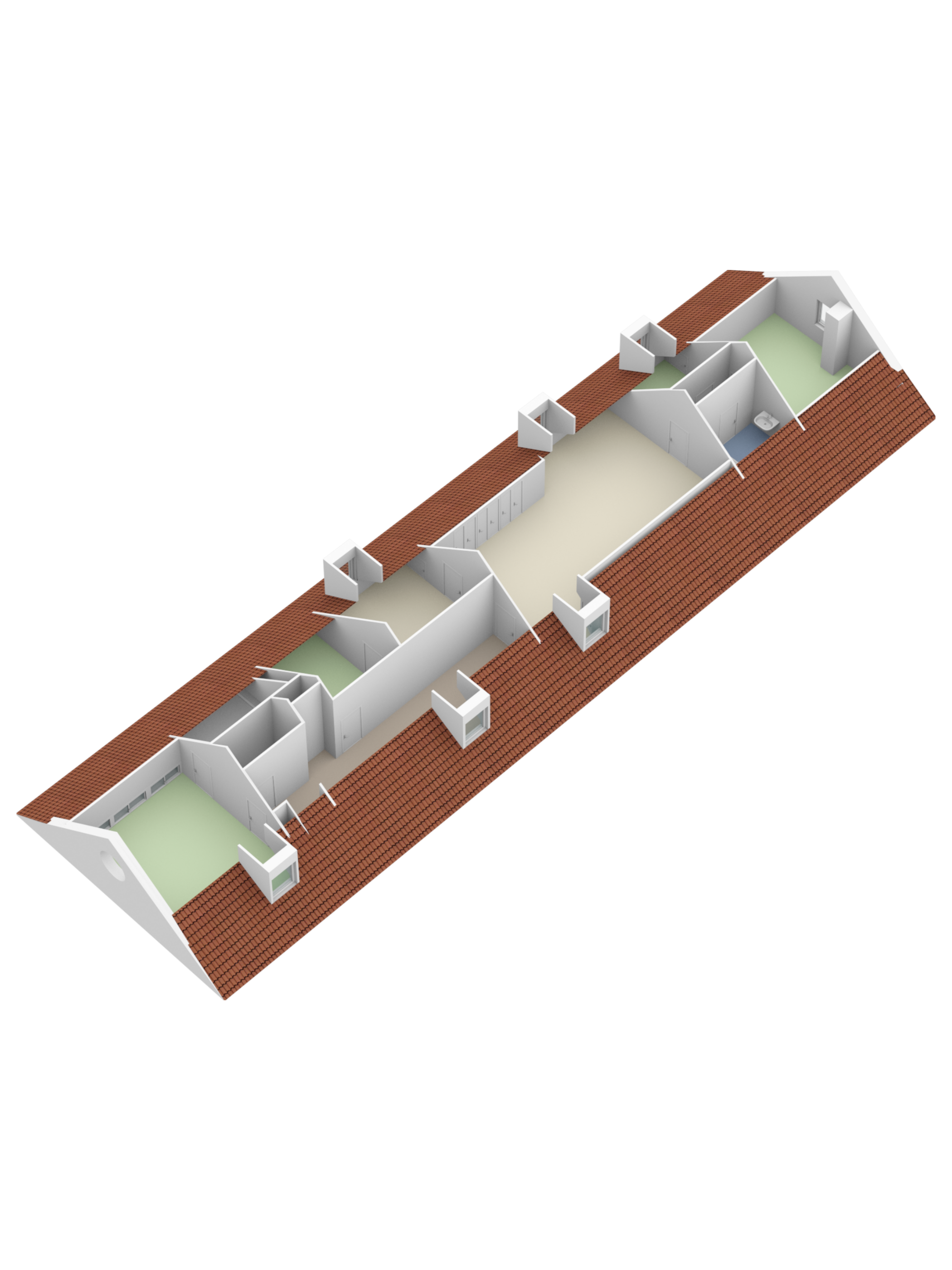 Vanuit de overloop is een appartement bereikbaar welk is voorzien van woonkamer, keuken met keukenblok en veel bergkasten onder het schuine gedeelte.