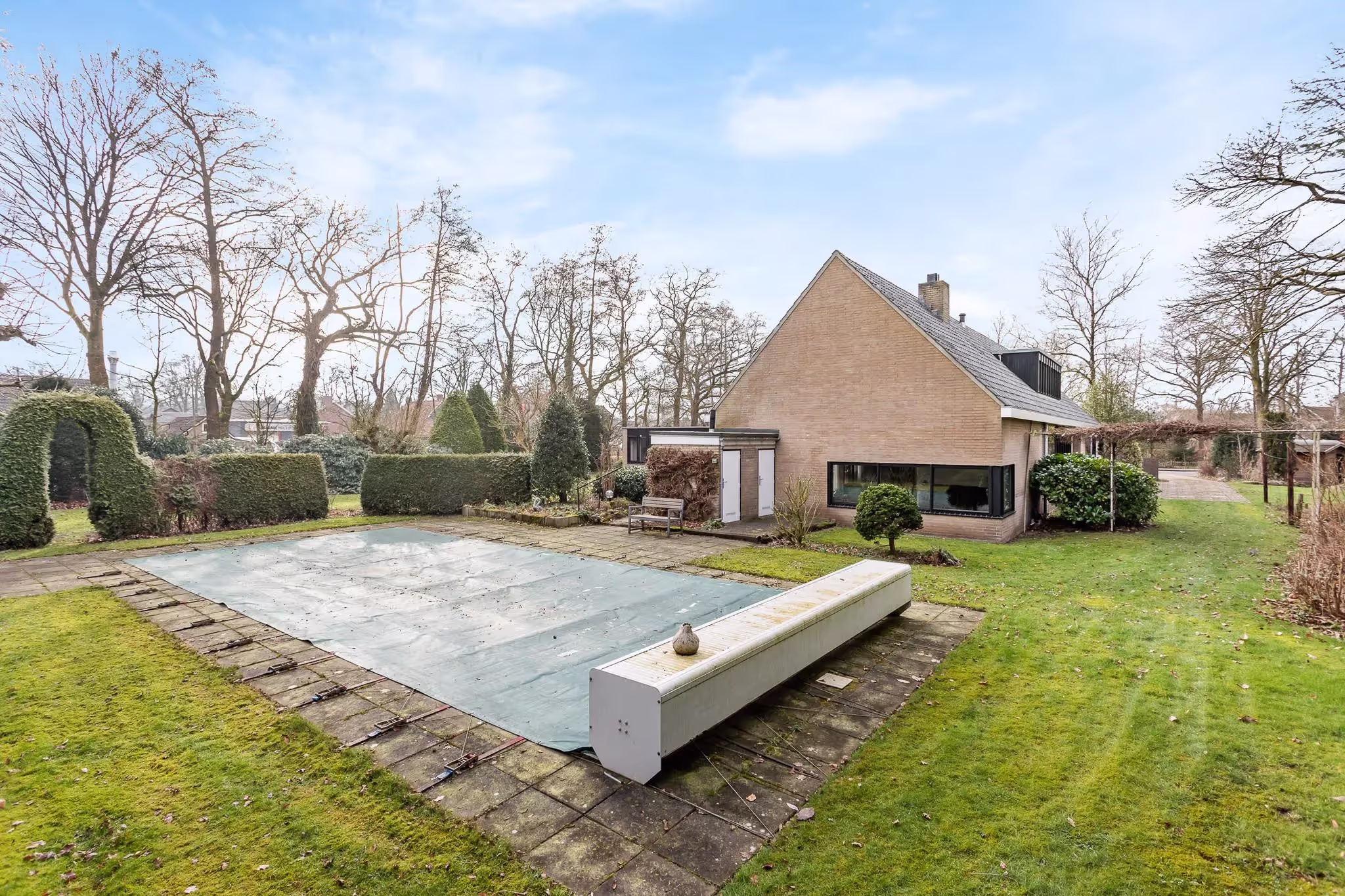 De parkachtige tuin rondom de woning is ideaal voor de tuinliefhebbers en/of voor spelende kinderen. Het overdekt terras biedt privacy en beschutting waarbij er tevens een mooi zicht op het zwembad is. Hier geniet je elk seizoen van de buitenruimte.