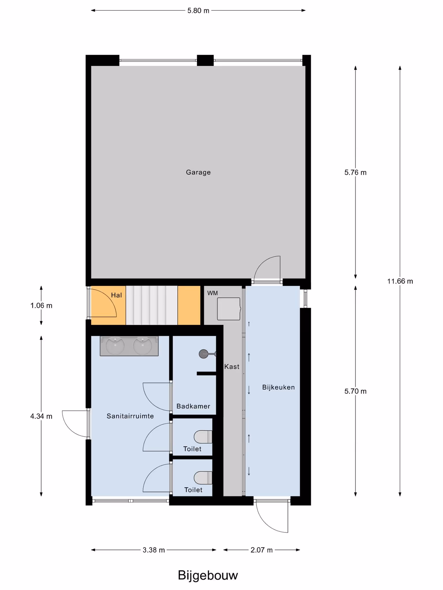 Bijgebouw begane grond, royale garage, bijkeuken met witgoedaansluitingen en veel kastruimte, sanitair ruimte met twee toiletten en afgesloten douche.