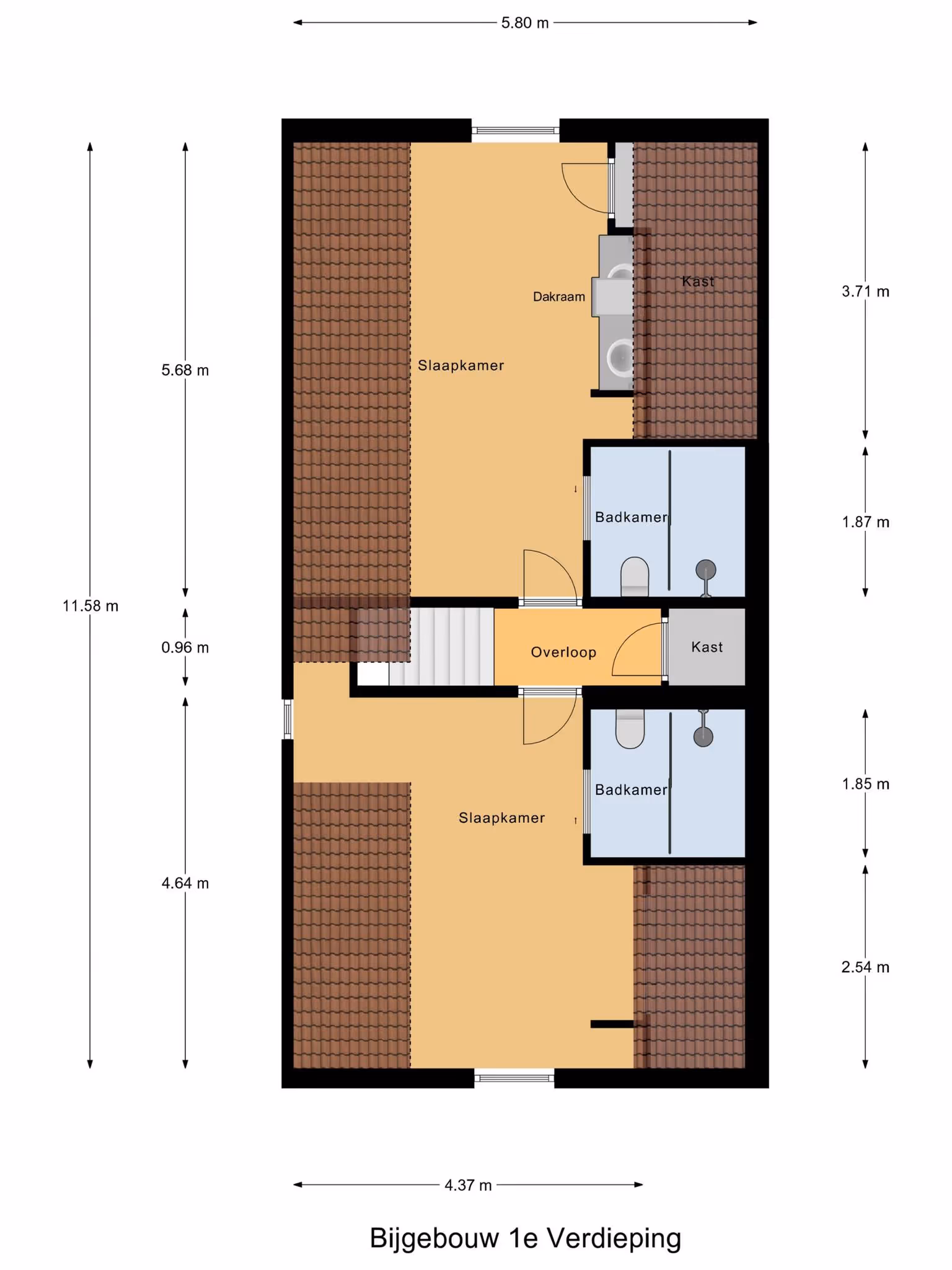 Eerste verdieping woonhuis, via eetkamer naar kantoorruimte, trap naar master bedroom met inloopkast en luxe badkamer (2021) met ligbad, dubbele douche, toilet en dubbele wastafel, via centrale hal toegang tot 2 extra slaapkamers (nu samengevoegd), CV-kast en tweede badkamer met douche, toilet en wastafel,