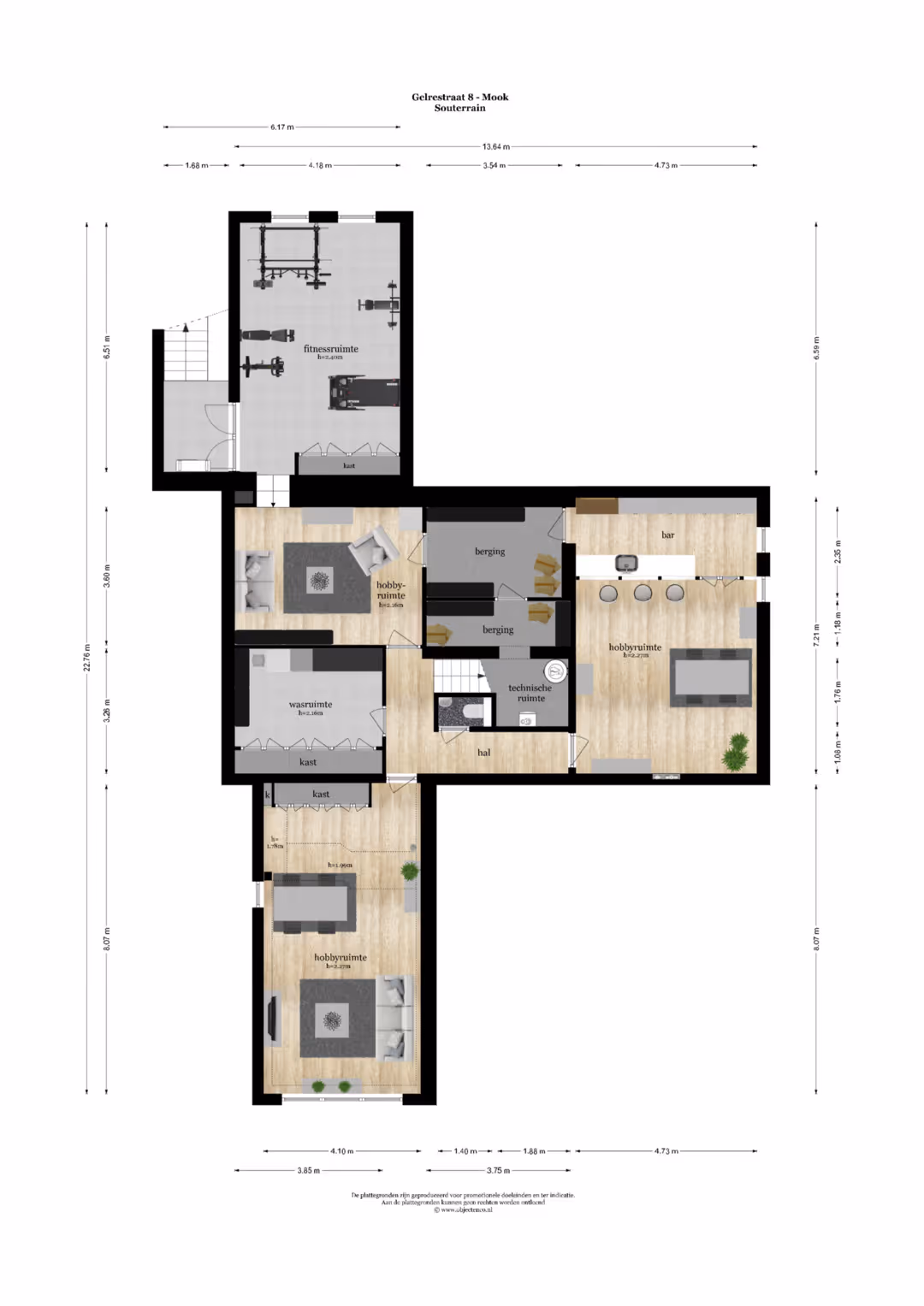 Souterrain: de woning is nagenoeg volledig voorzien van een onderverdieping. Hier bevinden zich o.a. een extra slaapkamer/ kantoorruimte, een ontspanningsruimte/ mancave met bar, een gym, toilet, een muziekkamer, wasruimte, diverse bergingen en de technische ruimte.