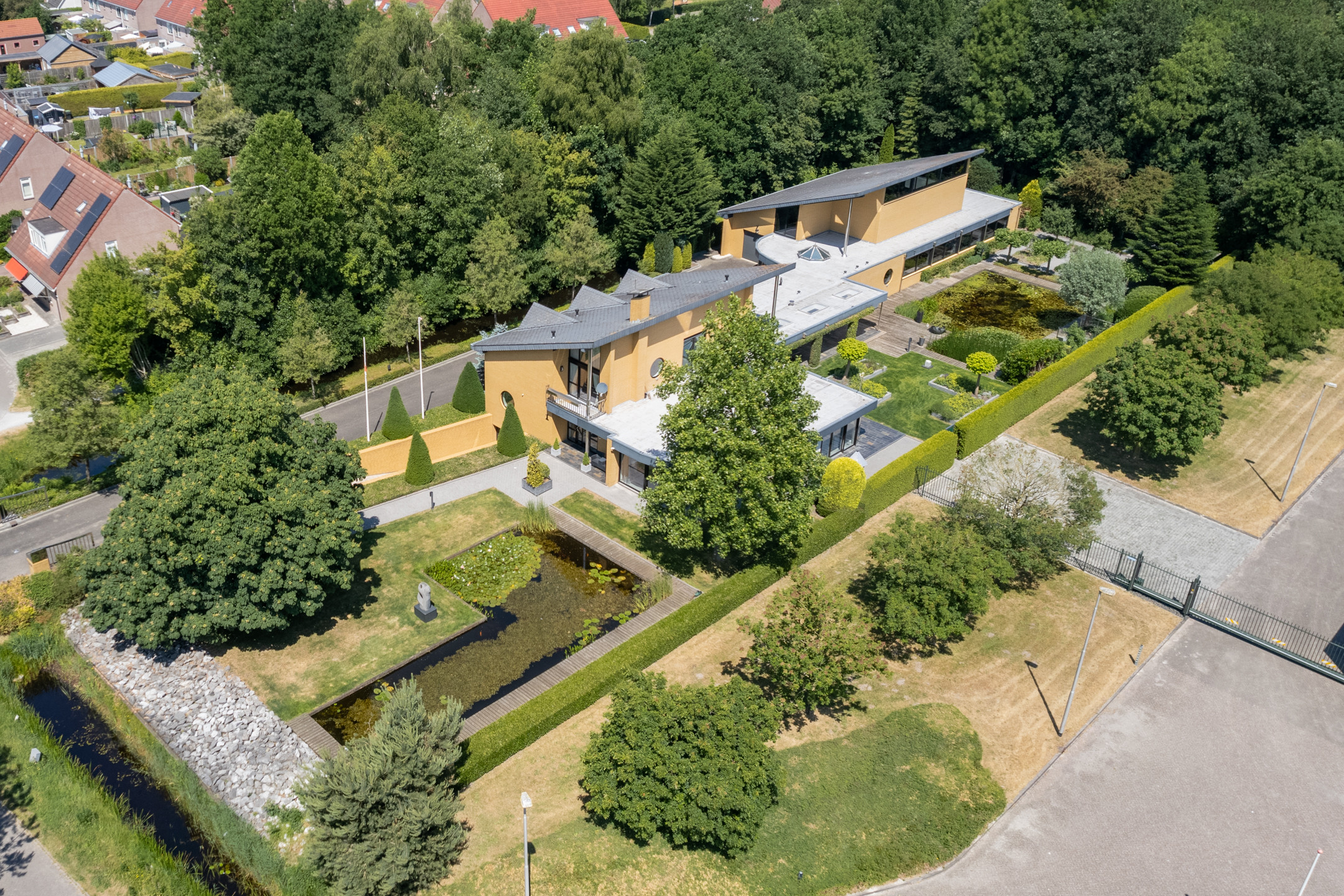 De buitenruimte verdient speciale aandacht. Rondom het huis ligt een prachtig aangelegde parkachtige tuin met verschillende terrassen, een grote vijver, fraaie sculpturen en een sfeervol tuinhuis. De tuin biedt rust, privacy en ruimte – perfect voor een borrel onder de veranda, een tuinfeest of gewoon een goed boek in de zon. Ook praktisch is alles tot in de puntjes geregeld: een ruime berging met extra keuken en plaats voor fietsen, gereedschap en tuinspullen.