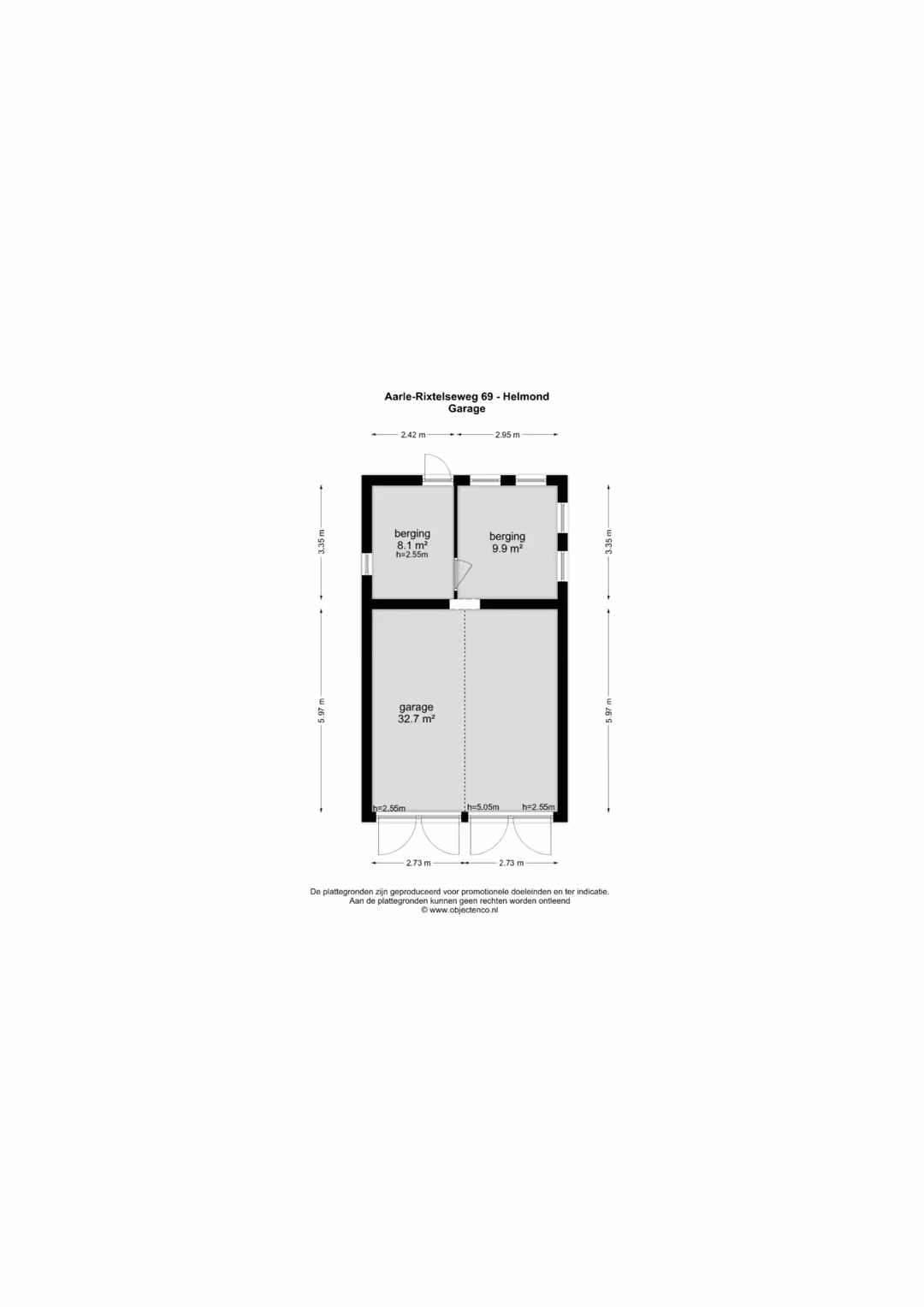 Het landhuis heeft een vrijstaande, dubbele garage. Deze is verdeeld in een garagegedeelte en een tweetal werkruimtes met een werkbank, opslag voor gereedschap en een grondwaterpomp. Boven deze kamers ligt een handige vliering.
