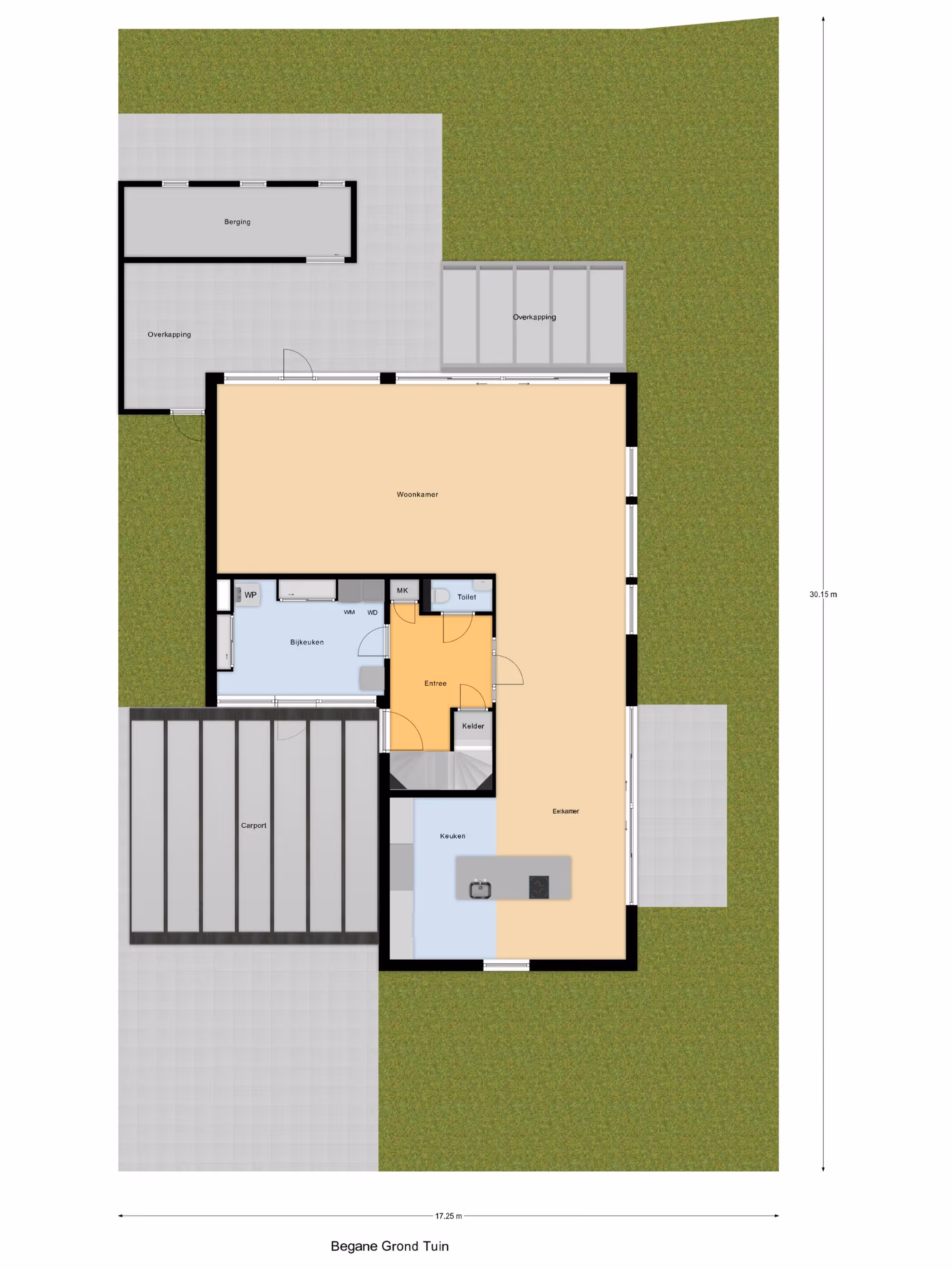 De inrichting van de tuin bestaat verder uit diverse beplanting, andere groenvoorzieningen, terrassen en een houten berging (waarvan de buitenkant bekleed is met onderhoudsvriendelijk potdeksel plaatwerk). Tevens is er aan weerszijden een achterom. Aan de voorzijde is er een carport geplaatst (ruim 3 meter hoog) en is er parkeergelegenheid voor meerdere auto's op eigen terrein.