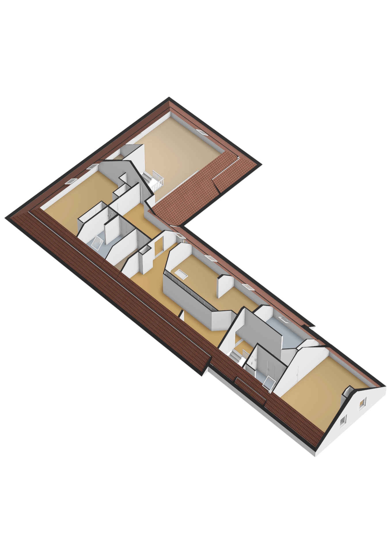 Zitkamer: Royale en sfeervolle vide ingericht als zitkamer, met een indrukwekkende kapconstructie en zichtbare houten balken. De ruimte is voorzien van vloerbedekking en meerdere dakramen, wat zorgt voor een lichte en open sfeer. De verdieping beschikt tevens over diverse praktische bergingen, waaronder een ruimte met de 2e cv-installatie.