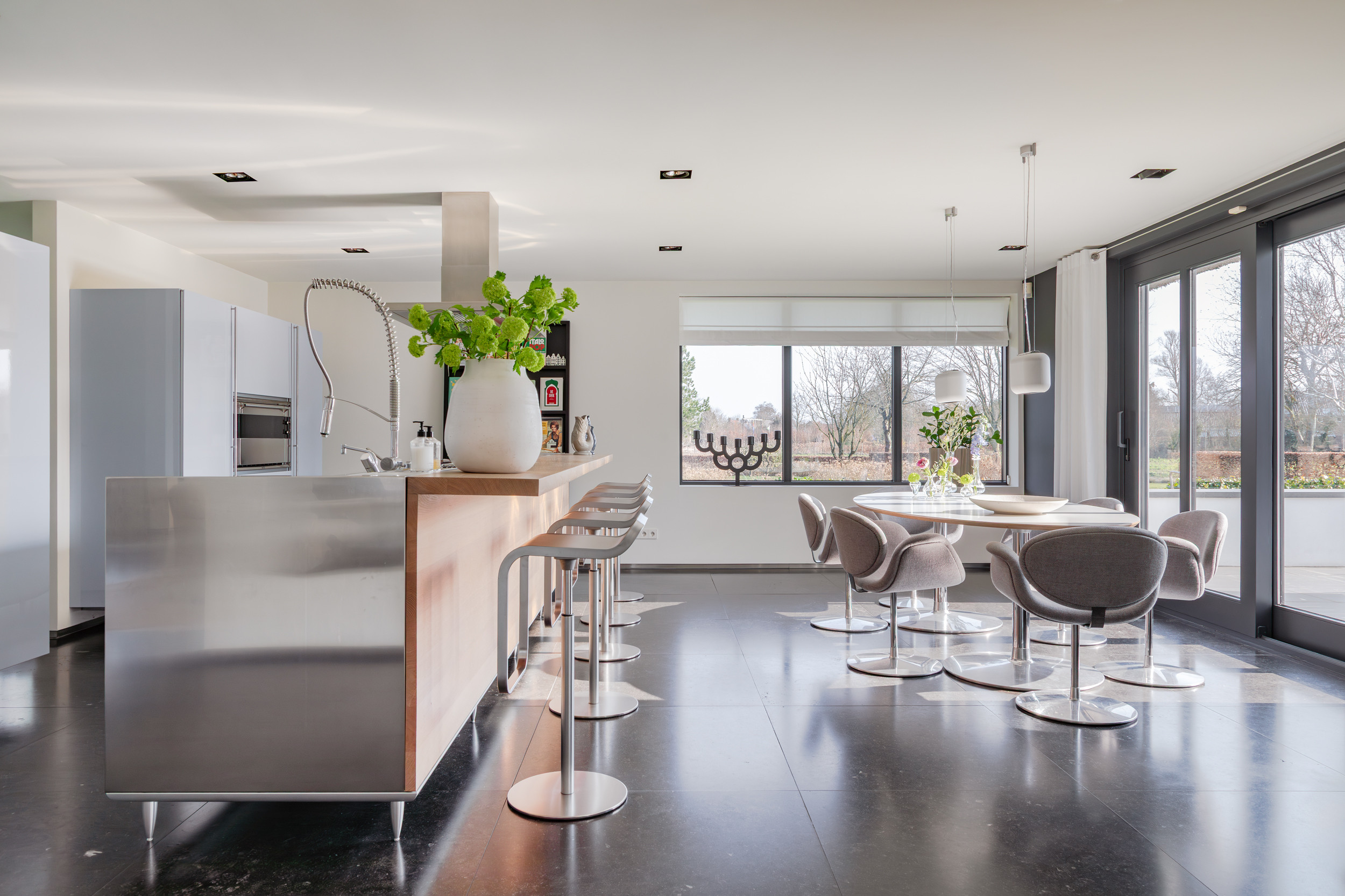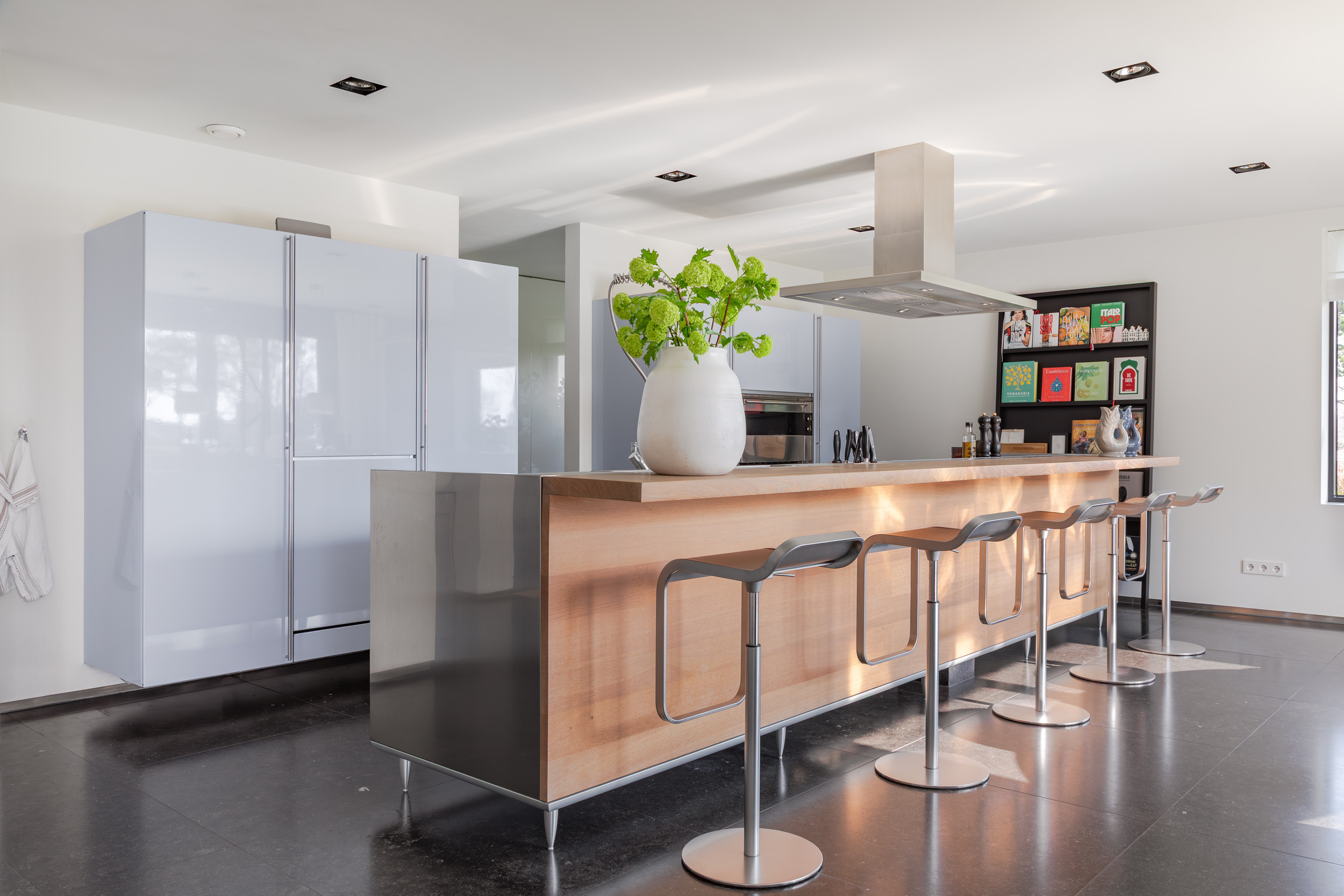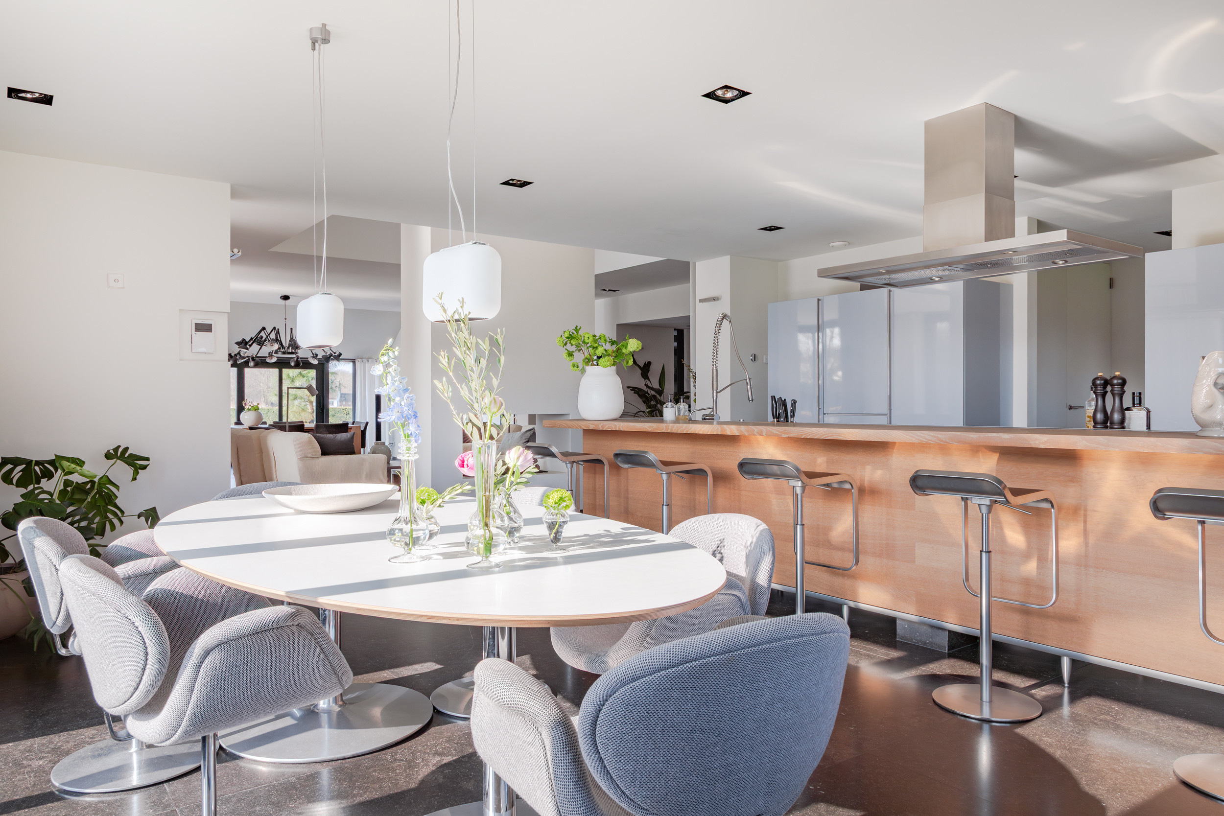 De living is royaal van opzet en biedt meerdere plekken om te verblijven. Hierdoor ontstaat een natuurlijke indeling waarbij u gedurende de dag voor elk moment een plek weet te vinden – van een rustige koffiemoment in de ochtend tot een lange avond aan tafel met vrienden of familie. Aansluitend bevindt zich de woonkeuken met een royaal kookeiland en hoogwaardige inbouwapparatuur. Grote openslaande deuren verbinden de keuken direct met het terras en de tuin. Op de begane grond bevinden zich daarnaast een lichte werkkamer, een stijlvolle bar voor gezellige avonden met vrienden en familie, een praktische bijkeuken en de inpandige garage voor twee auto’s, inclusief laadpaal. In de kelder bevindt zich een in 2023 gerenoveerde wijnkelder en een ruime berging.