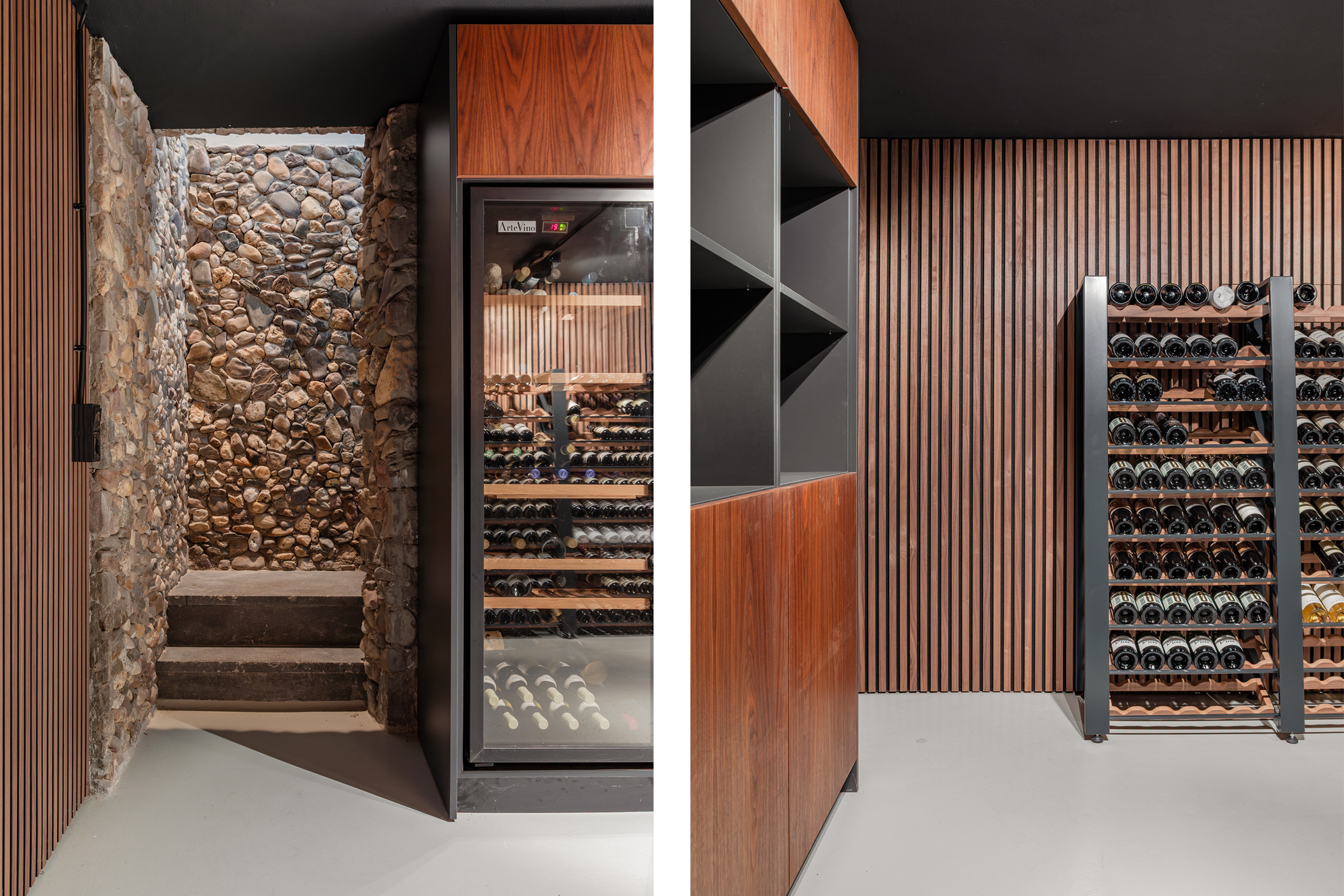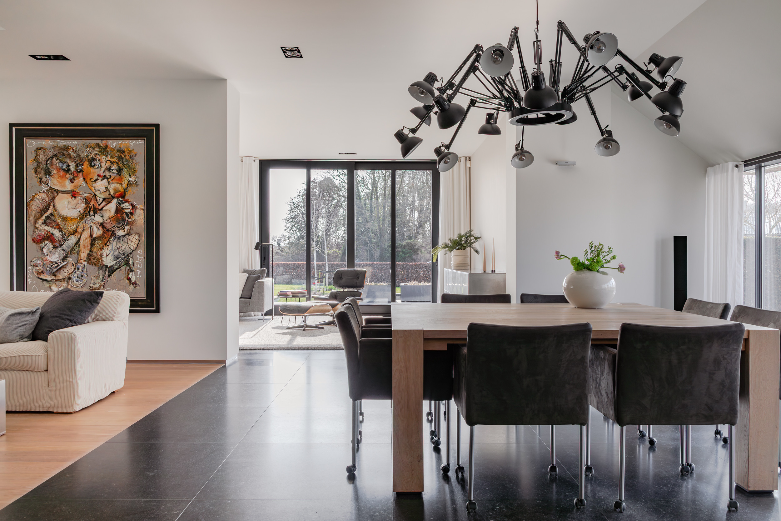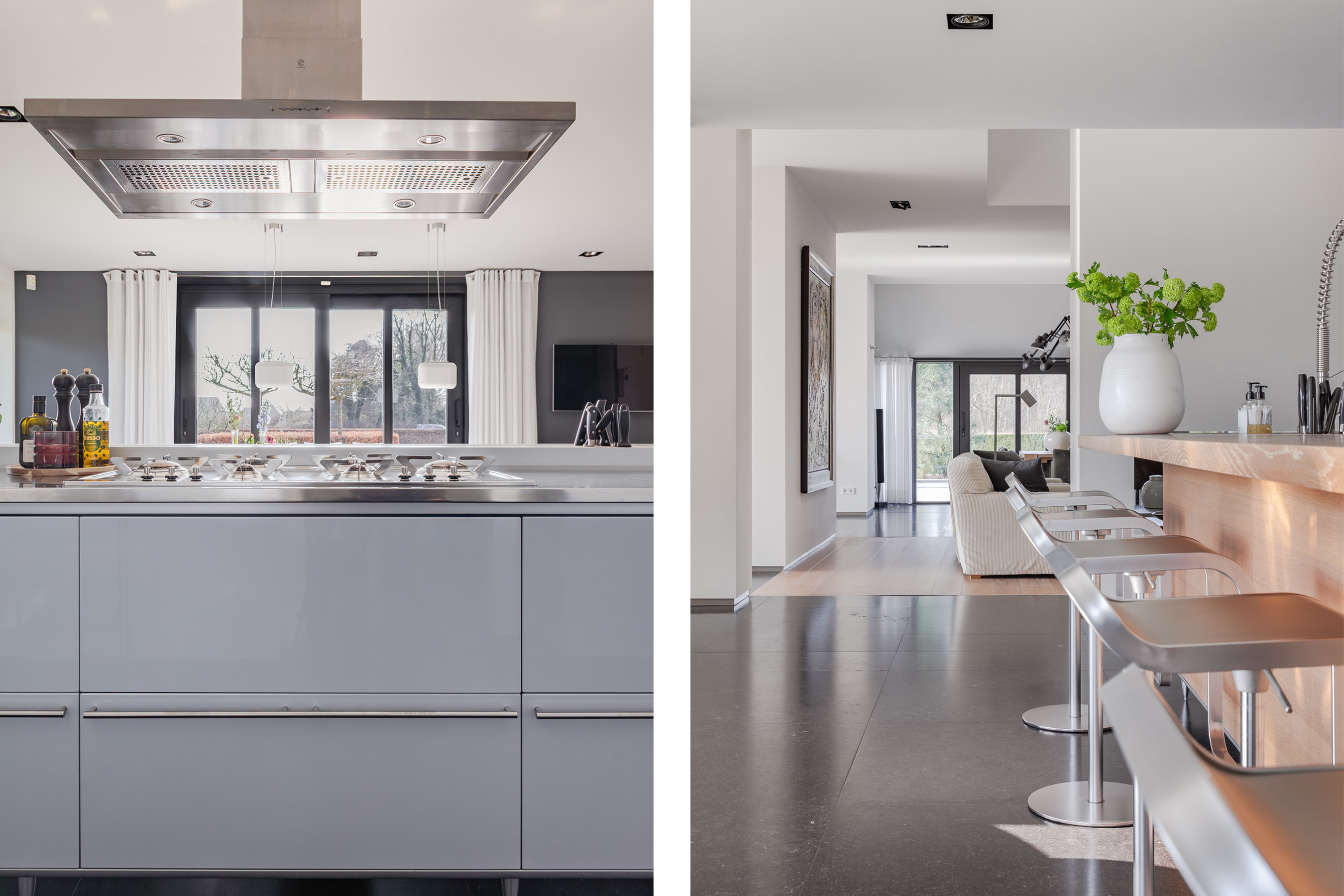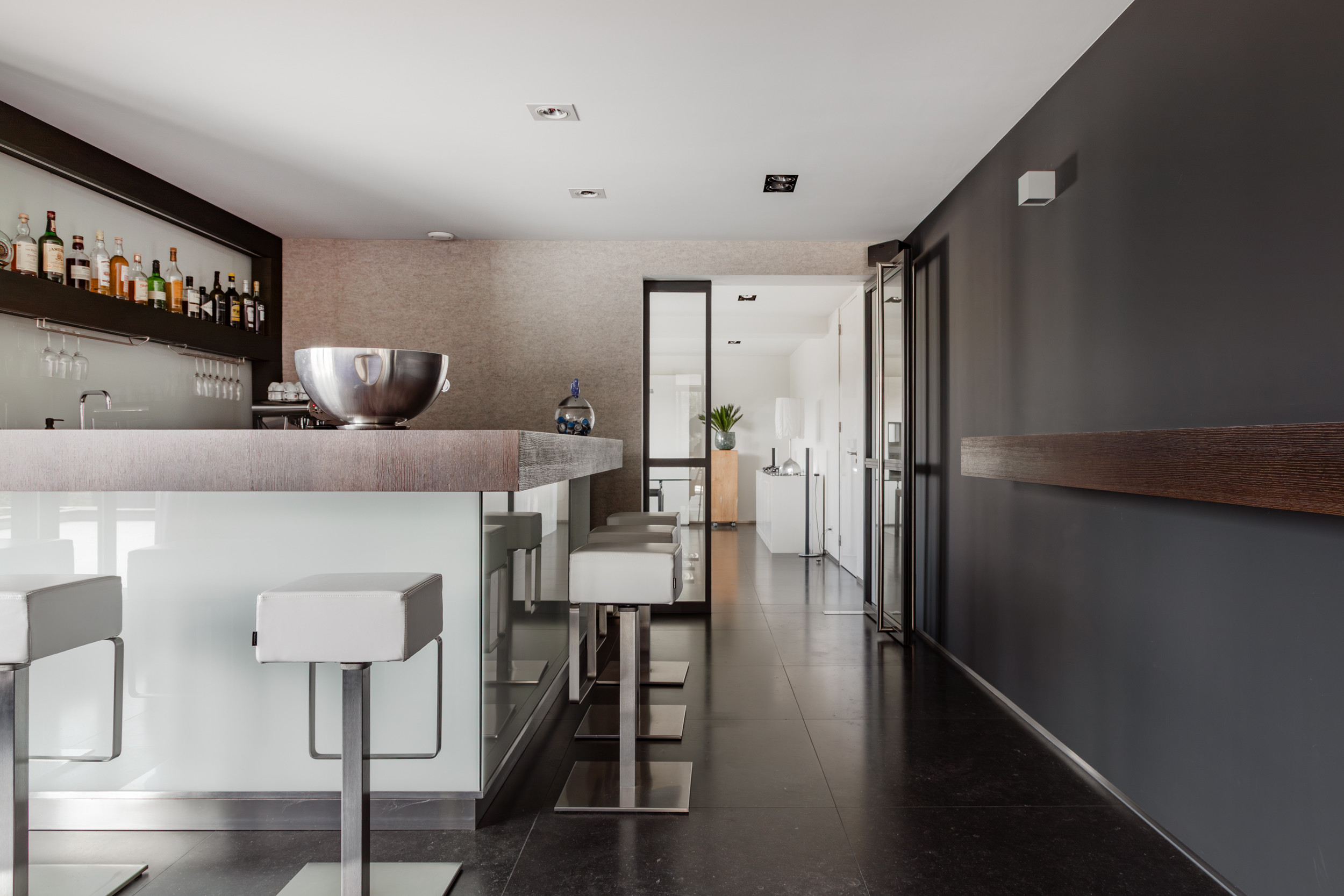 De living is royaal van opzet en biedt meerdere plekken om te verblijven. Hierdoor ontstaat een natuurlijke indeling waarbij u gedurende de dag voor elk moment een plek weet te vinden – van een rustige koffiemoment in de ochtend tot een lange avond aan tafel met vrienden of familie. Aansluitend bevindt zich de woonkeuken met een royaal kookeiland en hoogwaardige inbouwapparatuur. Grote openslaande deuren verbinden de keuken direct met het terras en de tuin. Op de begane grond bevinden zich daarnaast een lichte werkkamer, een stijlvolle bar voor gezellige avonden met vrienden en familie, een praktische bijkeuken en de inpandige garage voor twee auto’s, inclusief laadpaal. In de kelder bevindt zich een in 2023 gerenoveerde wijnkelder en een ruime berging.